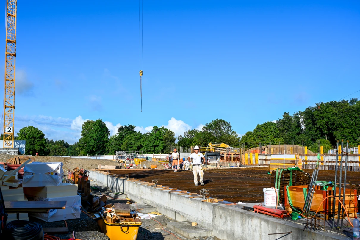 Der markante Baukörper setzt am Übergang zur offenen Wiesenlandschaft einen selbstbewussten Akzent. Sein Entwurf erinnert in seiner Anmutung an landwirtschaftliche Bauten, bewahrt jedoch eine eigenständige Gestaltung, die dem Ort eine klare Identität verleiht. Die lange Fassade wird durch eine klare Struktur und feine Farbabstufungen gegliedert und erhält so eine ausgewogene Wirkung im menschlichen Massstab.