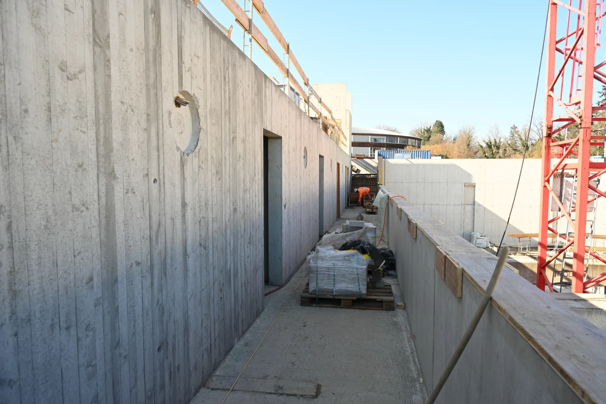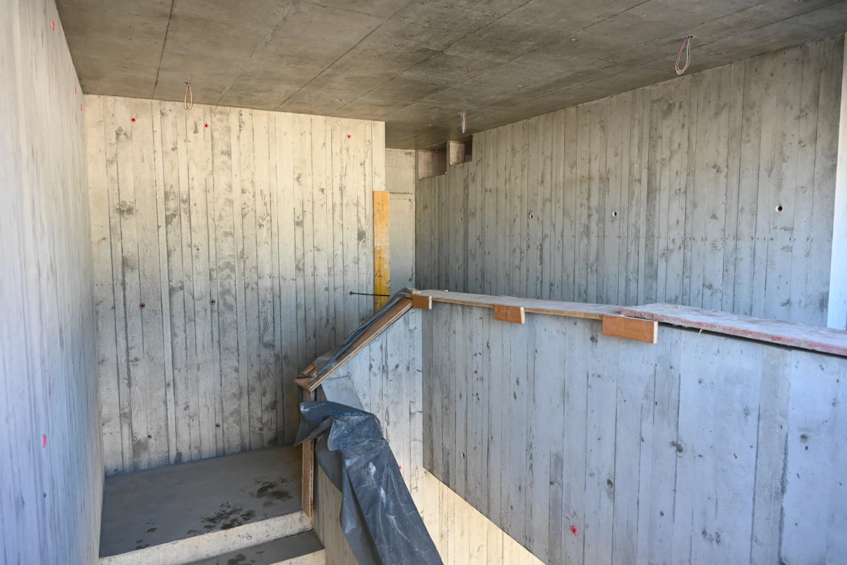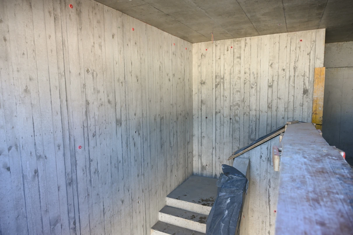 Ein besonderes Highlight des Projekts ist der 900 m² große Schutzraum, der gleichzeitig als Tiefgarage dient und den verfügbaren Raum effizient nutzt. Die 6 Meter hohen Turnhallenwände wurden aus Sichtbeton Typ 4.1.4 gefertigt, und auch die Treppenhauswände sowie Stützmauern außen wurden im Schalungstyp 3.1.4 ausgeführt, was das ästhetische und funktionale Design abrundet.