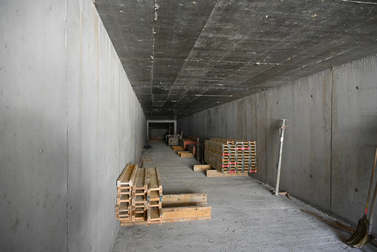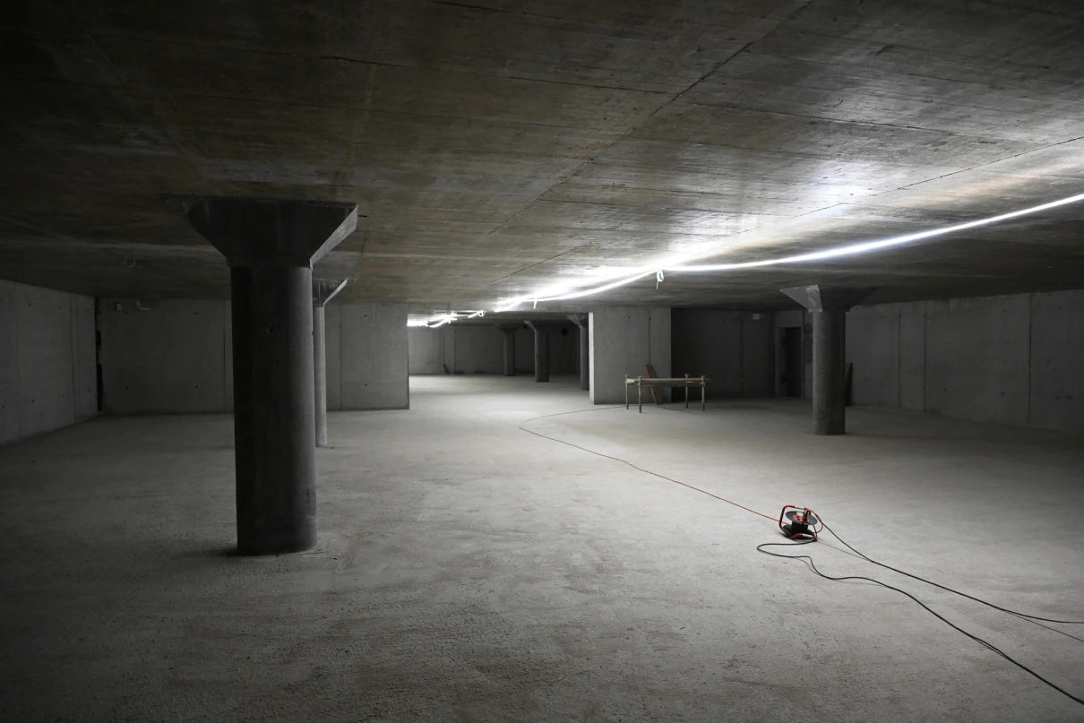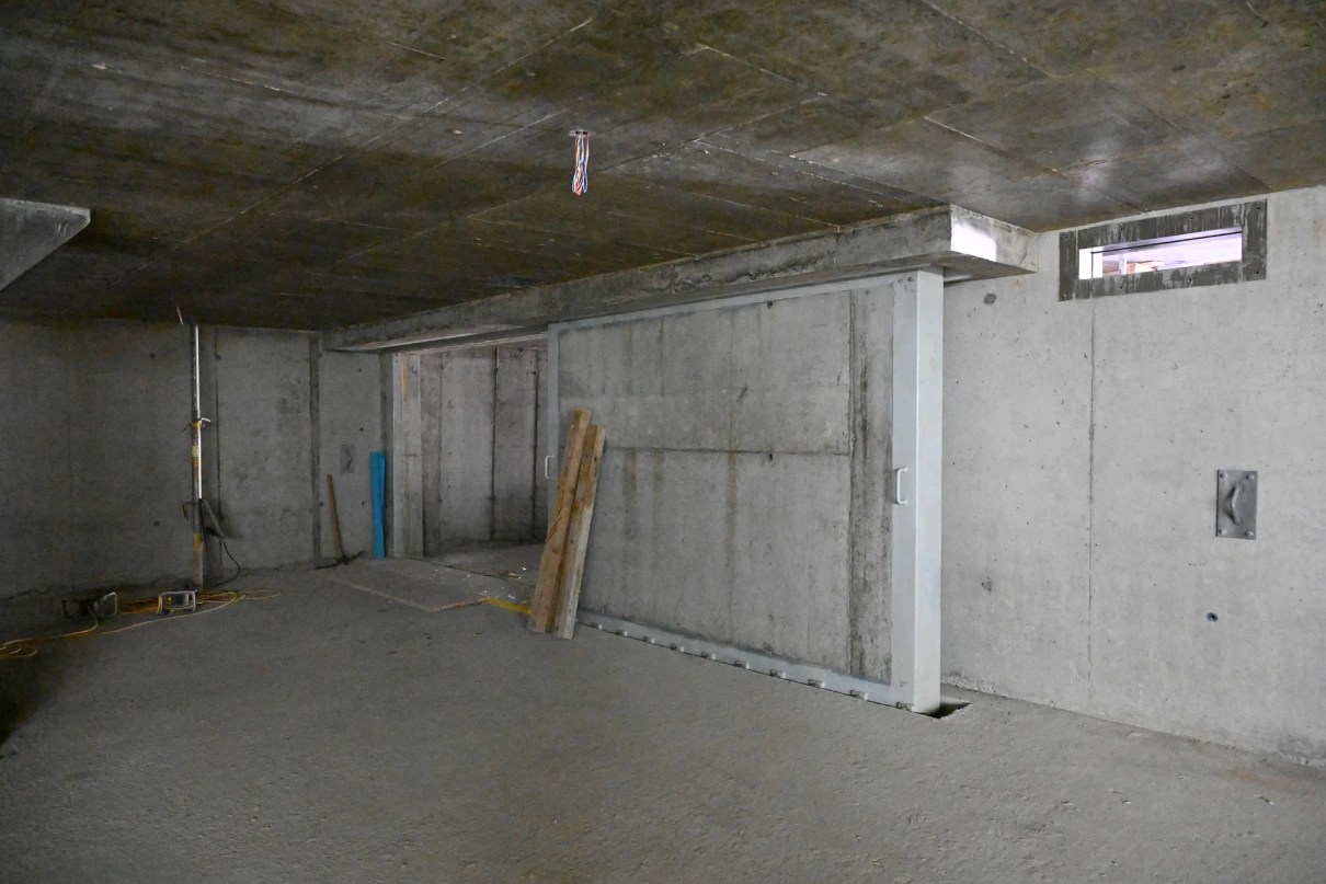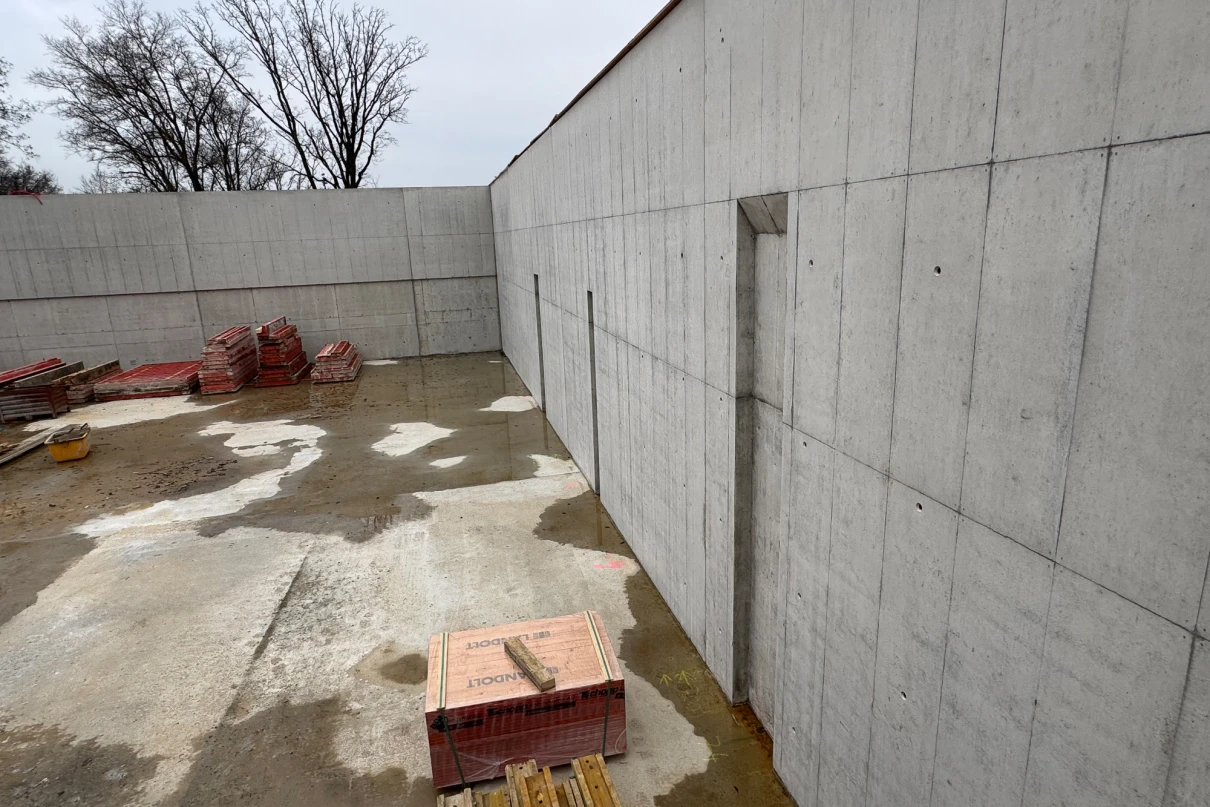 Ein besonderes Highlight des Projekts ist der 900 m² große Schutzraum, der gleichzeitig als Tiefgarage dient und den verfügbaren Raum effizient nutzt. Die 6 Meter hohen Turnhallenwände wurden aus Sichtbeton Typ 4.1.4 gefertigt, und auch die Treppenhauswände sowie Stützmauern außen wurden im Schalungstyp 3.1.4 ausgeführt, was das ästhetische und funktionale Design abrundet.