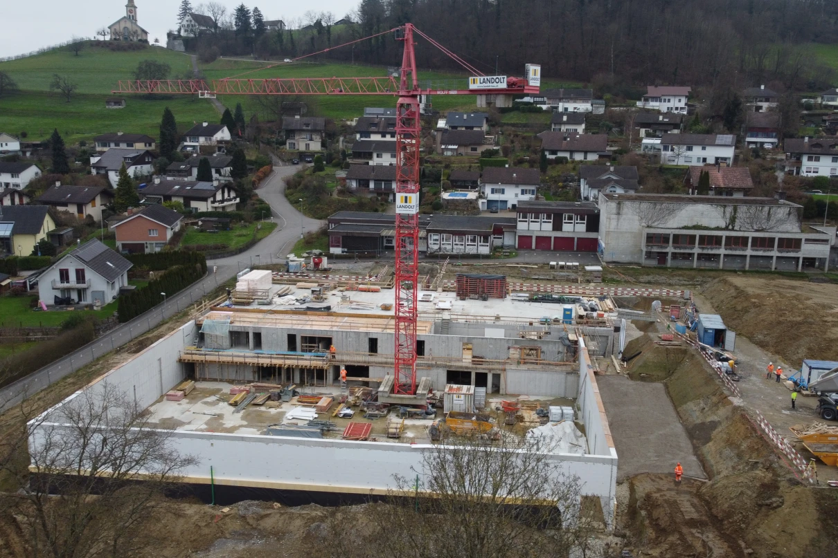 In Rüdlingen wird eine 2-Fach-Turnhalle in Hanglage gebaut. Unterhalb und neben dem Gebäude werden 800 Meter Kanalisation- und Meteorwasserleitungen verlegt und einbetoniert, wobei die Grabentiefen bis zu 3 Metern tief sind und gesprießt werden müssen. Die Turnhalle wird in Dichtigkeitsklasse DK 1 errichtet, um eine hohe Abdichtungsqualität zu gewährleisten.