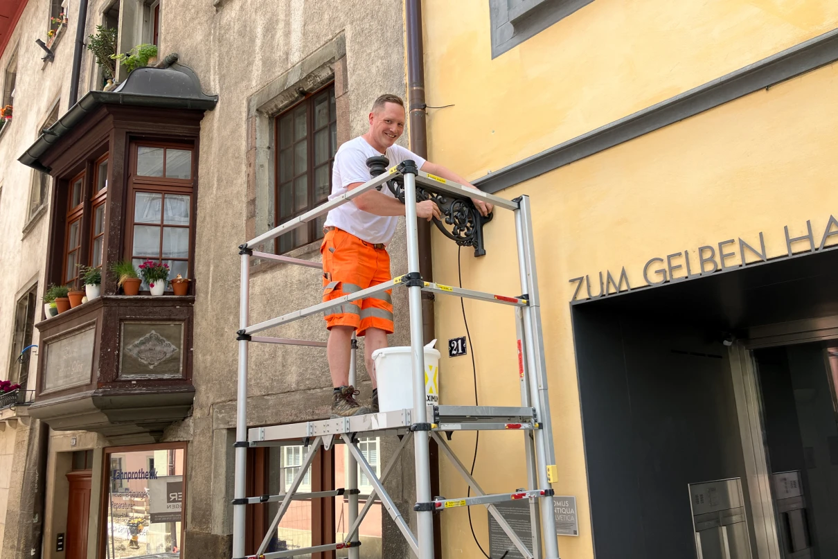 Für Kundenarbeiten der Heinz Kern AG war es wieder einmal ein super Jahr. Wir hatten sehr viele Aufträge, wo wir unser handwerkliches Geschick so richtig auf die Probe stellen konnten. Zuhause in historischen Altstätten entlang des Rheins, konnten wir zum Beispiel für die Stadt Schaffhausen die Stadtbeleuchtung Instand setzen und neue Sicherheitskameras montieren. Die Bilder sprechen für sich! Aber auch in Diessenhofen und Stein am Rhein konnten wir diversen Privathäusern einen neuen Schliff verpassen. Dabei kann es auch mal vorkommen, dass man wieder wie Ano dazumal Sumpfkalk anrühren und mit den feinsten Pigmenten das Städtchen Stein am Rhein in Schuss halten darf. Ein Privileg, dass unsere Mitarbeiter mit Stolz zum Besten bringen.