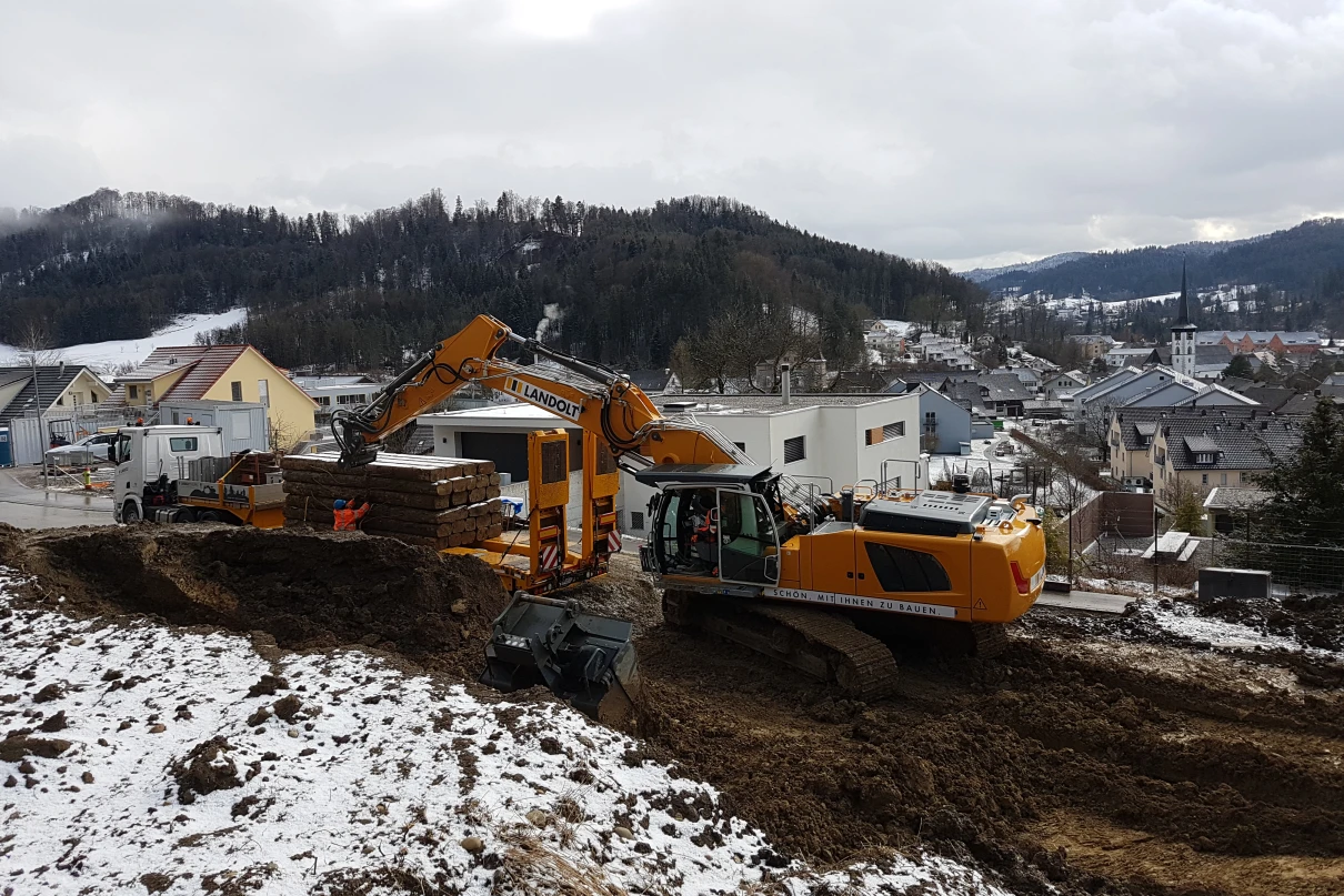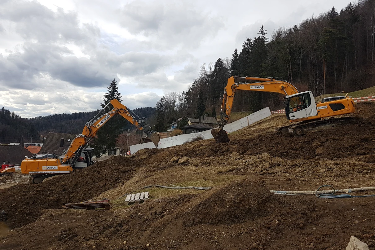 Die Aushubarbeiten wurden aufgrund der Hanglage abgetreppt auf mehreren Ebenen ausgeführt. Es mussten total ca. ca. 18`000 m³ Aushub abgegraben und abtransportiert werden.