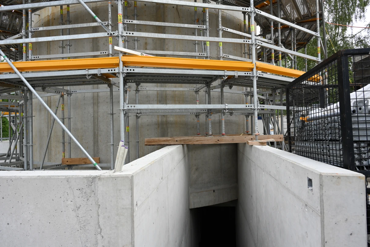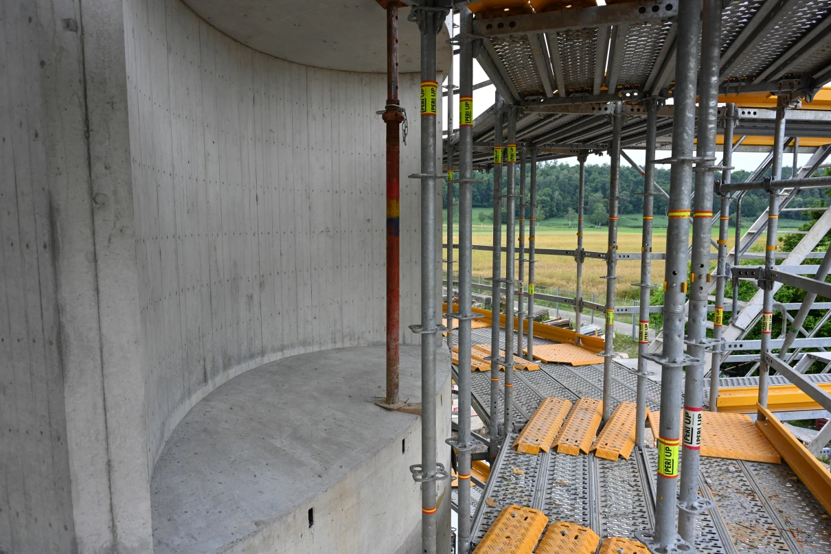 Für das Ausbildungszentrum Andelfingen bauen wir eine Flutungsanlage mit einem 23m hohen Wasserturm. Die Anlage wird genutzt um Ernstfälle rund ums Thema Überflutungen zu trainieren. 350 Kubikmeter Wasser kann der Turm fassen, um die fünf Kammern, sowie die Rampe zu fluten. Mit komplexen Pumpsystem wird das Wasser nach Beendung der Übung wieder zurück in den Turm gepumpt. Um der anspruchsvollen Geometrie des Wasserturms gerecht zu werden, wurde ein Schalungskonzept in Zusammenarbeit mit Peri AG ausgearbeitet.
