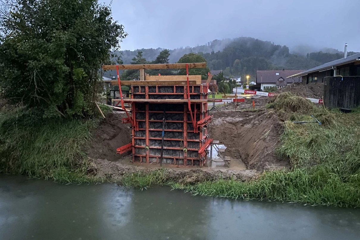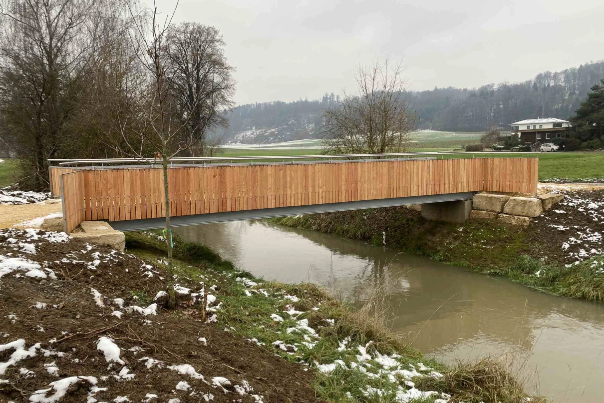 Die neue Fussgängerbrücke in Ramsen überwindet den Fluss Biber. Sie hat eine Spannweite von 16 m und eine Breite von fast 2 m. An beiden Ufern wurden massive Betonfundamente erstellt, welche mit Stahlträgern verbunden wurden.