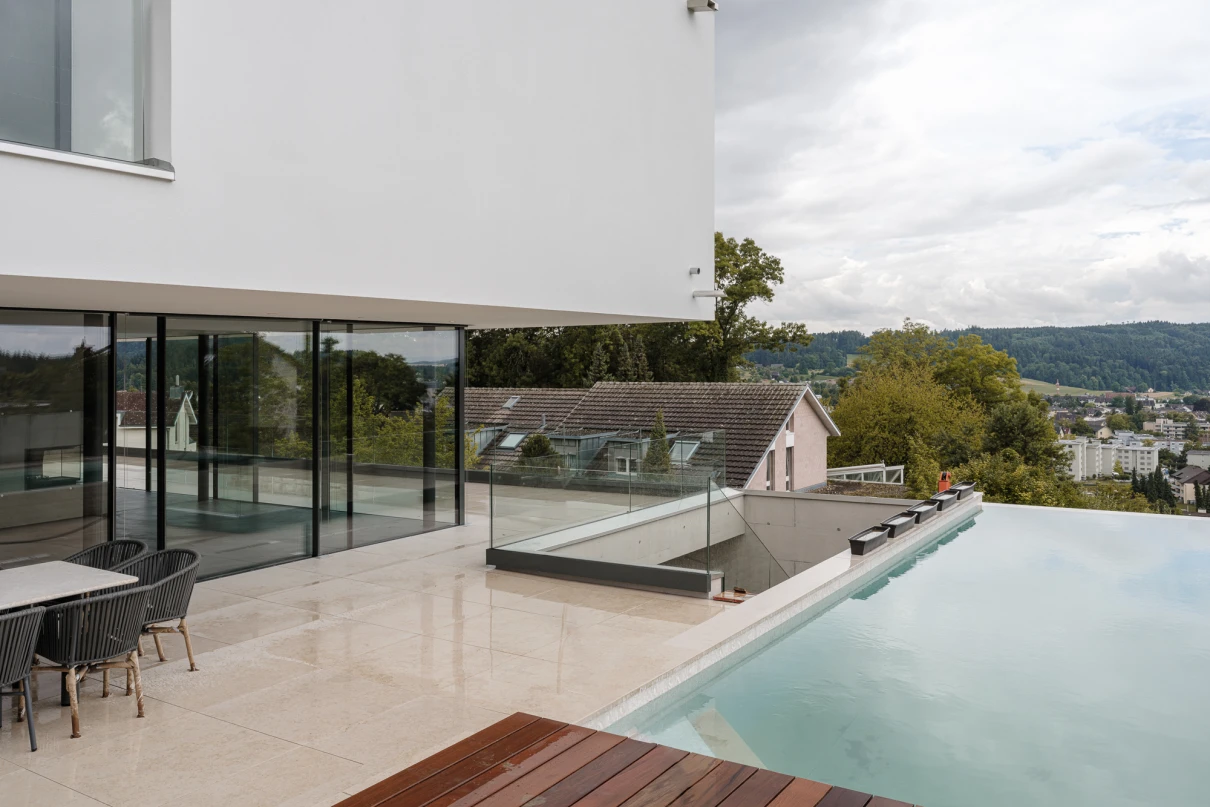 Neubau eines Einfamilienhauses mit zwei Poolanlagen, einem Lift sowie einer Sauna.