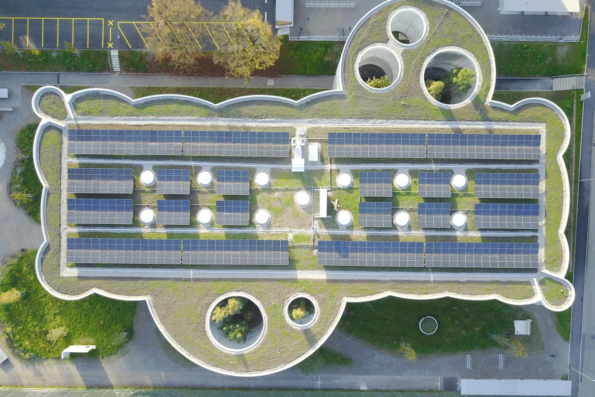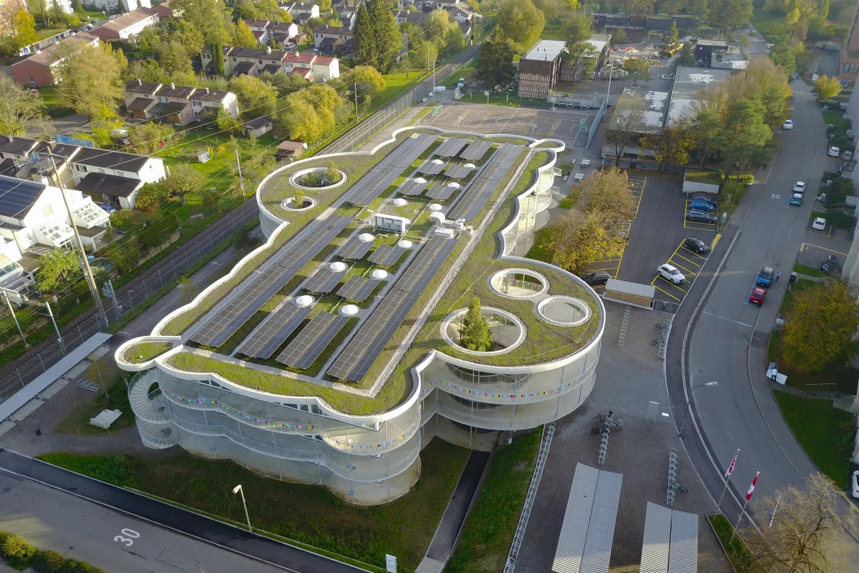 Das Schulhaus Wallrüti ist ein dreigeschossiger Pausen- und Lernbereich in Form umlaufender wolkenförmiger Laubengänge mit hängender Gärtenbepflanzung, welche die Relation des Klassenzimmers zum Aussenraum neu als Freiluftschule definiert.